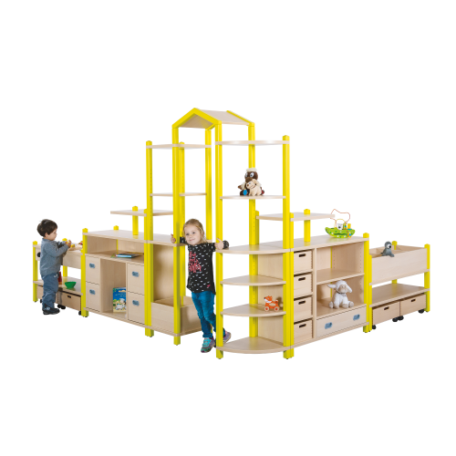 Dieses Regalsystem eignet sich perfekt für die Einrichtung von Gruppenräumen, Spiel- und Leseecken.