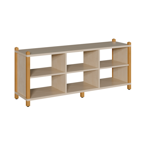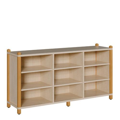 Das Raumteilerregal ist ein 3reihiges Regal in stabiler Stollenbauweise mit 2 Mittelwänden in 2 verschiedenen Höhen und stellt in 6 bzw. 9 Fächern Stauraum zur Verfügung. Aufgrund der großen Breite besitzt das Regal mittig einen zusätzlichen 5. Stützfuß. Die beiden Varianten bieten eine Ausführung mit einseitiger Rückwand und eine weitere mit beidseitigem Regalzugang an. Die Korpusteile bestehen aus 19 bzw. 25 mm dicker E 1-Feinspanplatte mit einer dekorativen Melaminharzbeschichtung, alle Kanten sind mit 2 mm - ABS-Sicherheitskanten ausgeführt. Das Korpusdekor ist ebenso wählbar wie die Stollenfarbe.