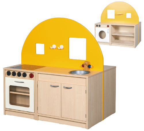 Praktische Details wie ein drehbarer Wasserhahn, ein herausnehmbares Spülbecken, eine Kochfeldnachbildung und farbige Drehknöpfe aus Kunststoff bringen echtes Küchenfeeling in die Kinderspielwelt. Bei dieser Spielmöbelkombination ist sogar die Waschmaschine mit integriert. Die hochwertig verbauten Materialien sind leicht zu reinigen.