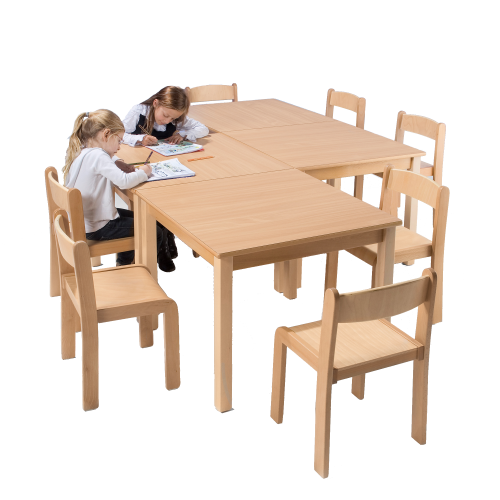 Beine und Zargenrahmen dieser Tische sind aus massivem Buchenholz gefertigt. Die quadratischen Tischplatten haben eine Stärke von ca. 19 mm und sind beidseitig mit Schichtstoff belegt, die Kante besteht aus einem abgerundeten Buche-Massivholzeinleimer. Die sehr widerstands- und strapazierfähige Beschichtung eignet sich hervorragend für den Einsatz im Kindergartenbereich.